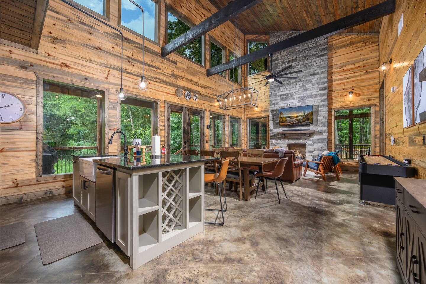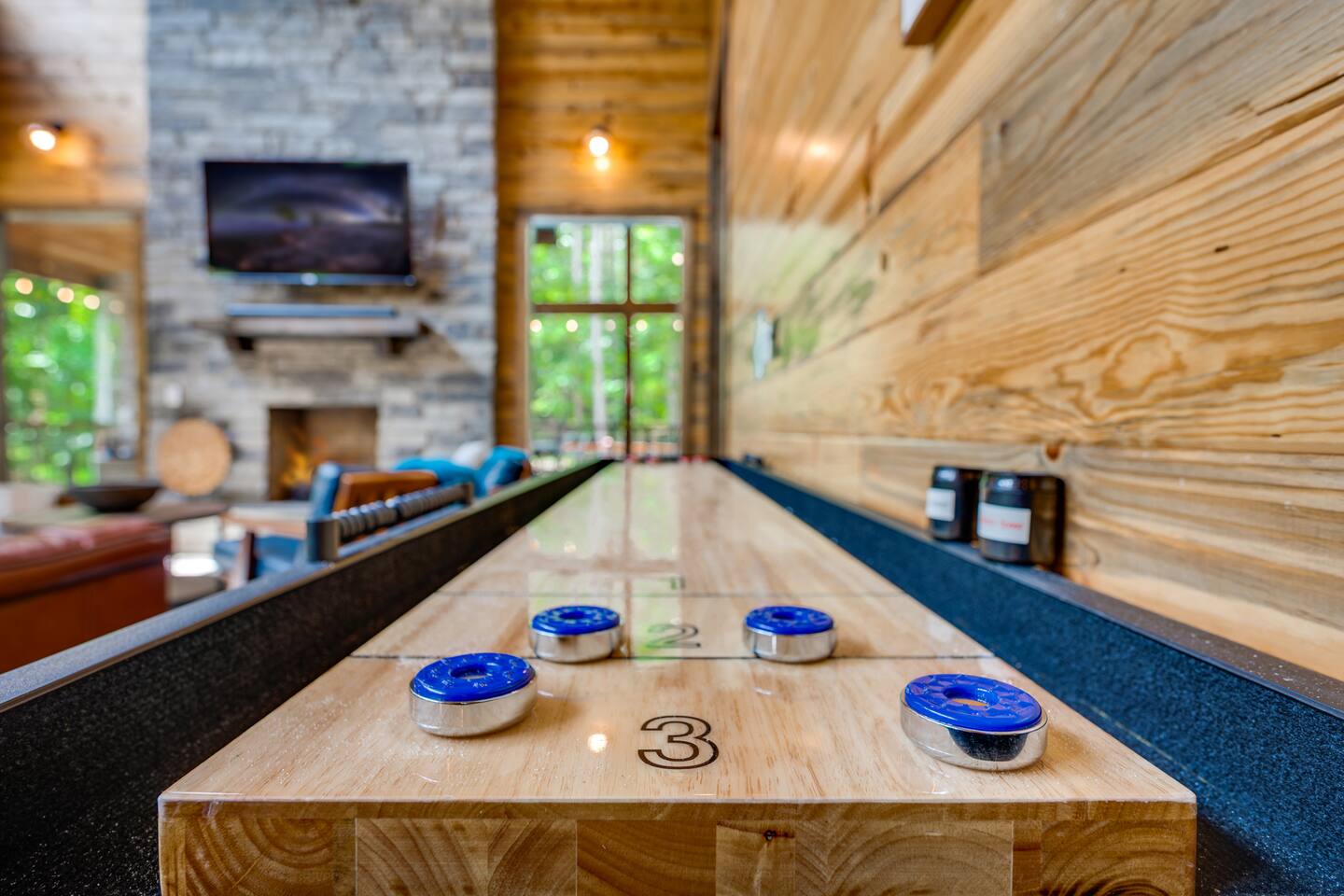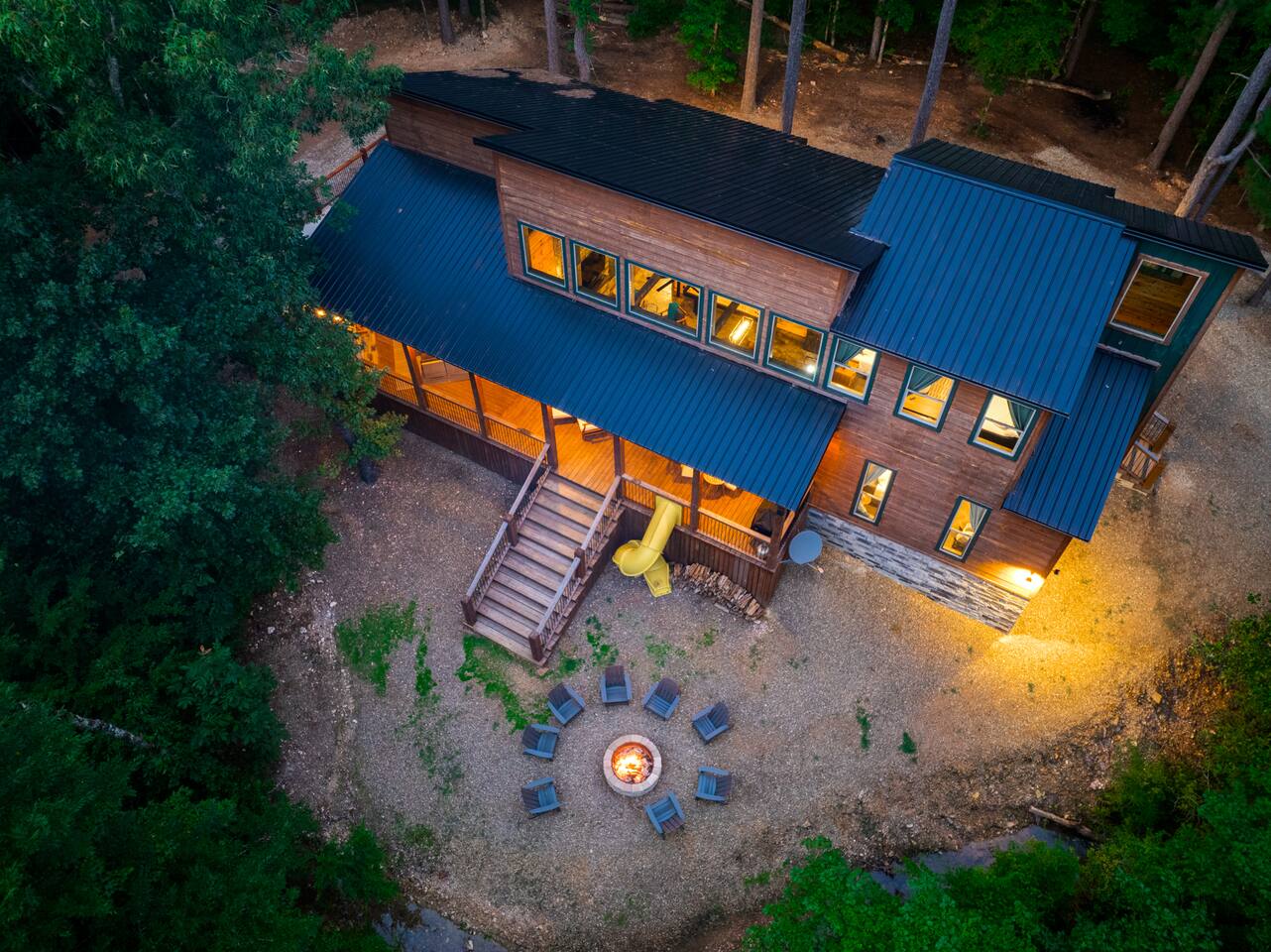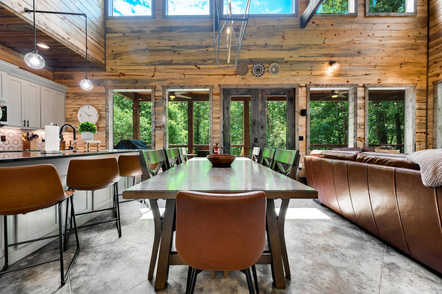 Escape to Aquila, a creek side retreat that sleeps 15. Enjoy the serenity of the rustling pines on the expansive covered patio spaces, complete with a private hot tub & a brand new (June 2025) heated pool for year-round relaxation! Indoors, enjoy classic arcade games and shuffleboard, alongside open living space. The outdoor space features a tube slide and a fire pit where you will hear the sounds of the creek, which is perfect for getting your toes wet and catching minnows.