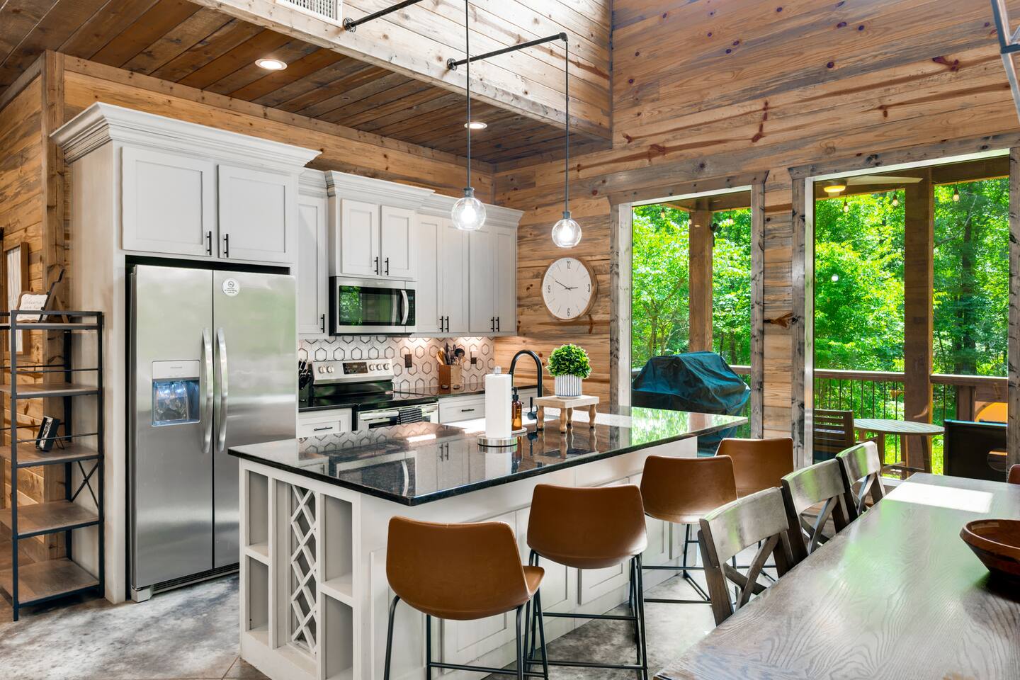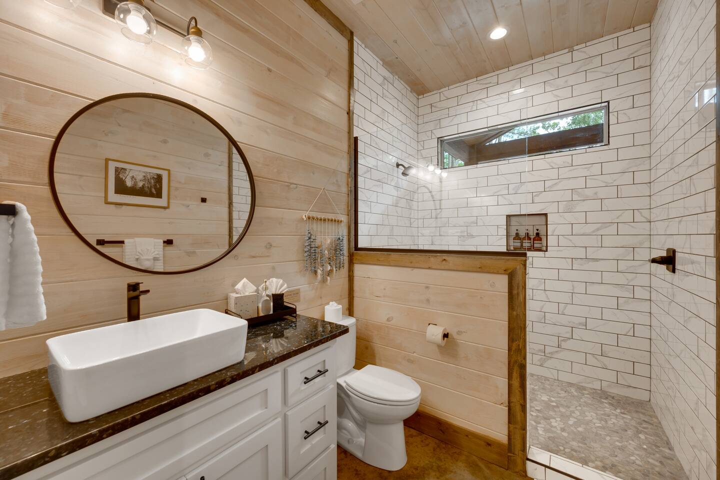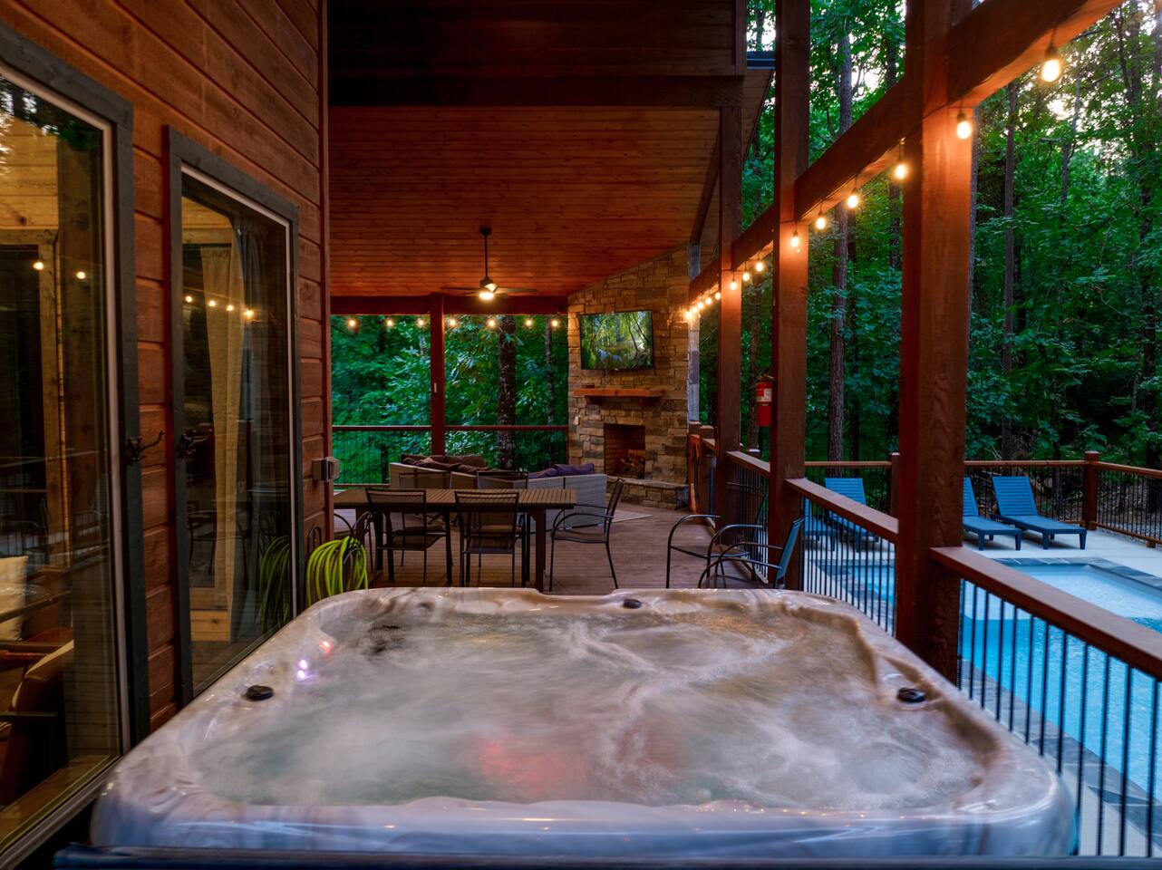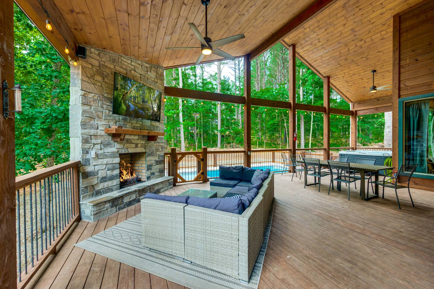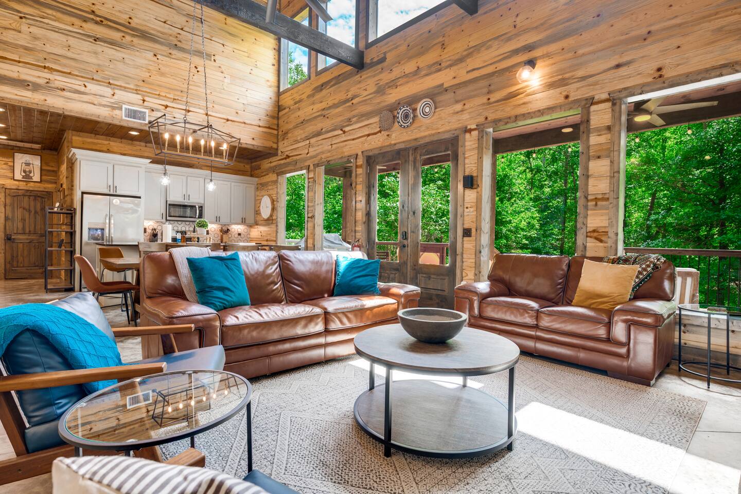 Escape to Aquila, a creek side retreat that sleeps 15. Enjoy the serenity of the rustling pines on the expansive covered patio spaces, complete with a private hot tub & a brand new (June 2025) heated pool for year-round relaxation! Indoors, enjoy classic arcade games and shuffleboard, alongside open living space. The outdoor space features a tube slide and a fire pit where you will hear the sounds of the creek, which is perfect for getting your toes wet and catching minnows.